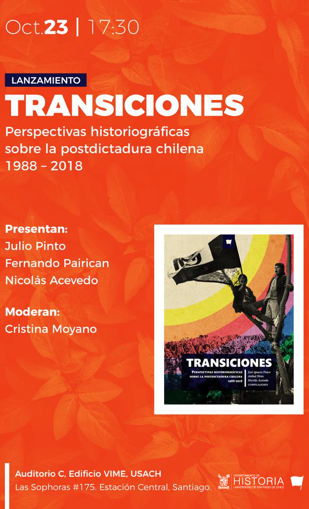 La Directora del Departamento de historia de la Universidad de Santiago de Chile, Dra. Cristina Moyano tiene el agrado de invitarlo a usted al lanzamiento del libro “Transiciones. Perspectivas historiográficas sobre la postdictadura chilena. 1988 – 2018”, libro que se constituye en un esfuerzo colectivo de un conjunto de historiadoras e historiadores por desmantelar un proceso transicional hacia la democracia